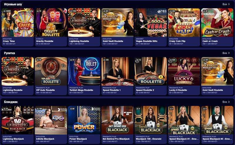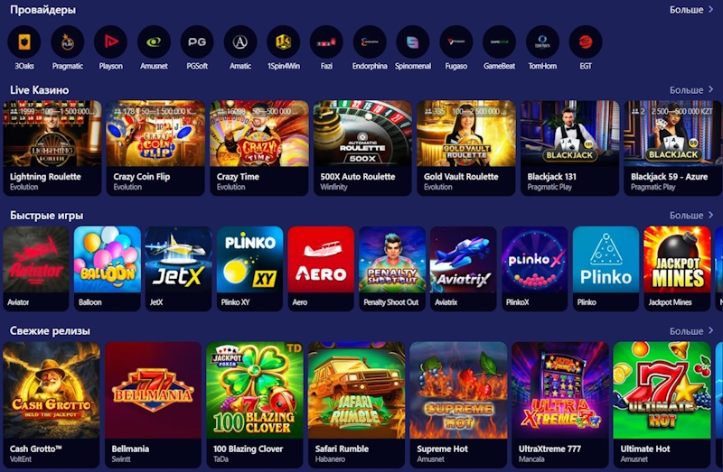 Платформа предлагает более 10 000 развлечений, включая свыше 8 500 слотов от 85 провайдеров. Каталог включает как классические автоматы с фруктовой тематикой, так и современные видеослоты с бонусными функциями и механикой Megaways. Есть настольные игры, покер, рулетка, баккара, а также большой выбор live-игр с настоящими дилерами. Дополняет коллекцию виртуальный спорт, который особенно популярен у молодых игроков.